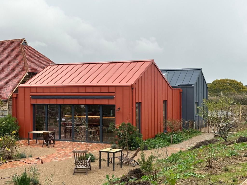 The Knepp Estate in West Sussex, designed by Kaner Olette Architects, recently underwent an expansive development focused on sustainability and rewilding. The Metal Roof Company was thrilled to contribute by supplying eco-friendly SSAB GreenCoat® PLX Pural for the Wilding Kitchen & Shop, featuring a vivid Tile Red finish for the main building and a Mountain Grey Pural color for the rear, complemented by matching rainwater gutters. Covering 380 M² with Swedish Steel, this project not only promotes environmental responsibility but also enhances the aesthetic of the historic farmland.